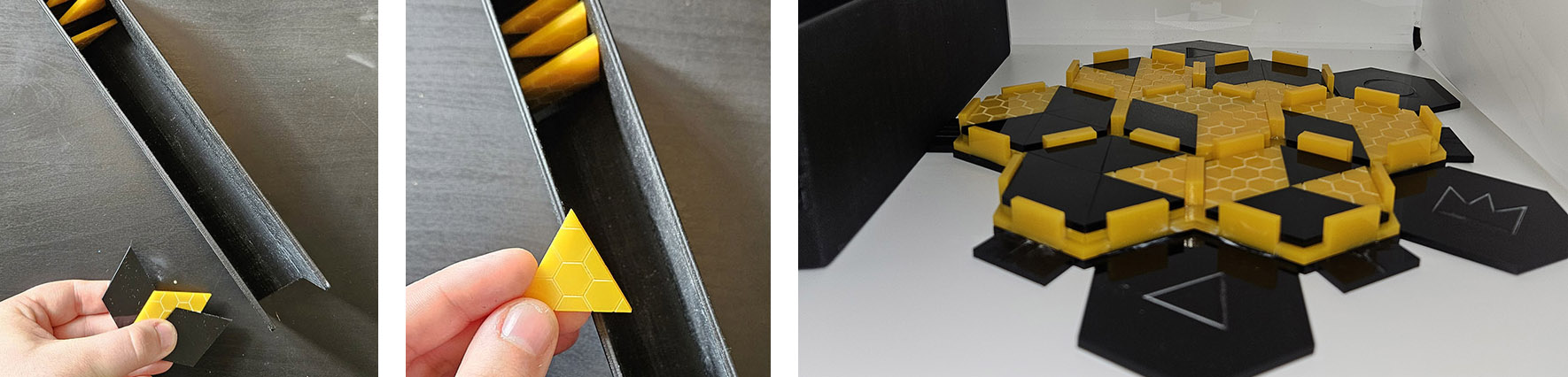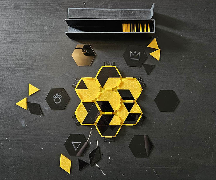 It allows for inclusive play with or without sighted participants. The game utilizes two distinct and contrasting colours for easy identification by visually impaired players. Additionally, pieces are varied in shape and texture, enabling blind players to quickly discern them by touch. Centred around social deduction, the gameplay emphasizes verbal interaction over visual elements, minimizing reliance on game pieces traditionally essential in sight-dependent games.