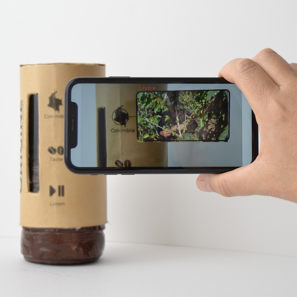 ORIGINE is a Specialty Coffee brand which aims to enhance the coffee experience through an innovative packaging. Thanks to technologies such as WebAR, the consumer will be able to see live the plantation where his coffee comes from, relax listening to the natural sounds and understand everything about the journey and the processes the coffee went through before ending up in a cup. The dosing system that can be attached to the package, is made out used coffee ground, it helps the consumer to grind just the right amount of coffee, keeping it fresh and avoiding waste.